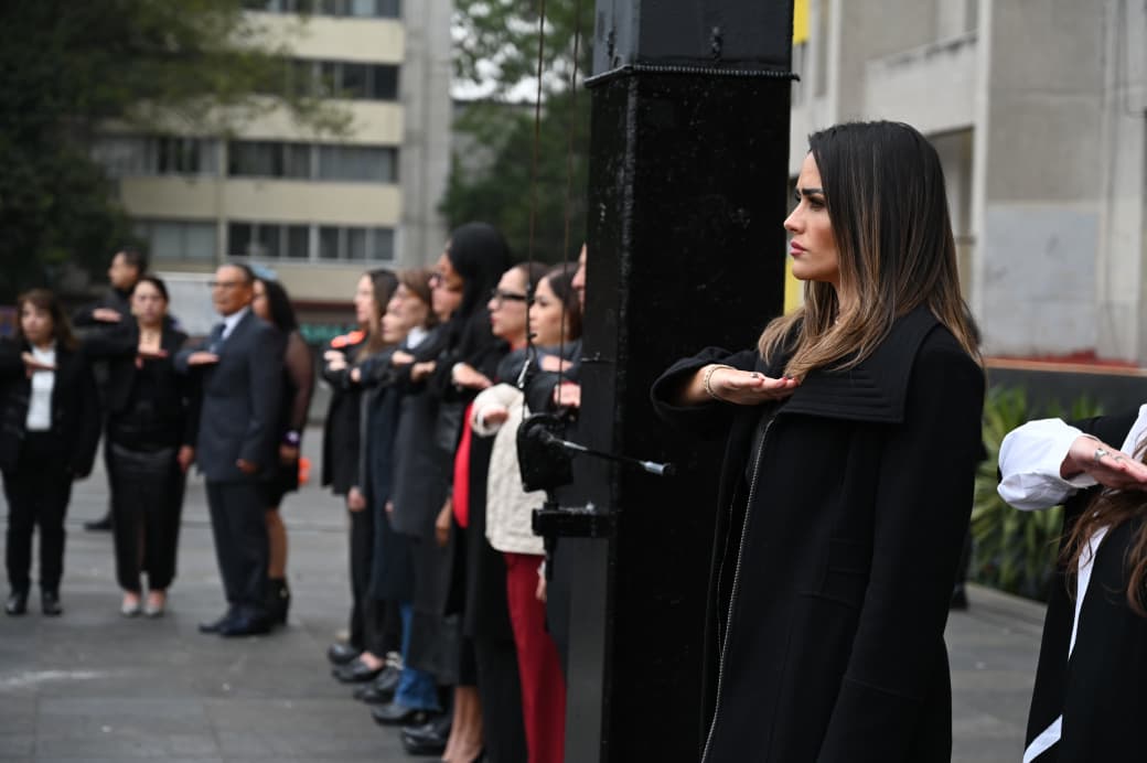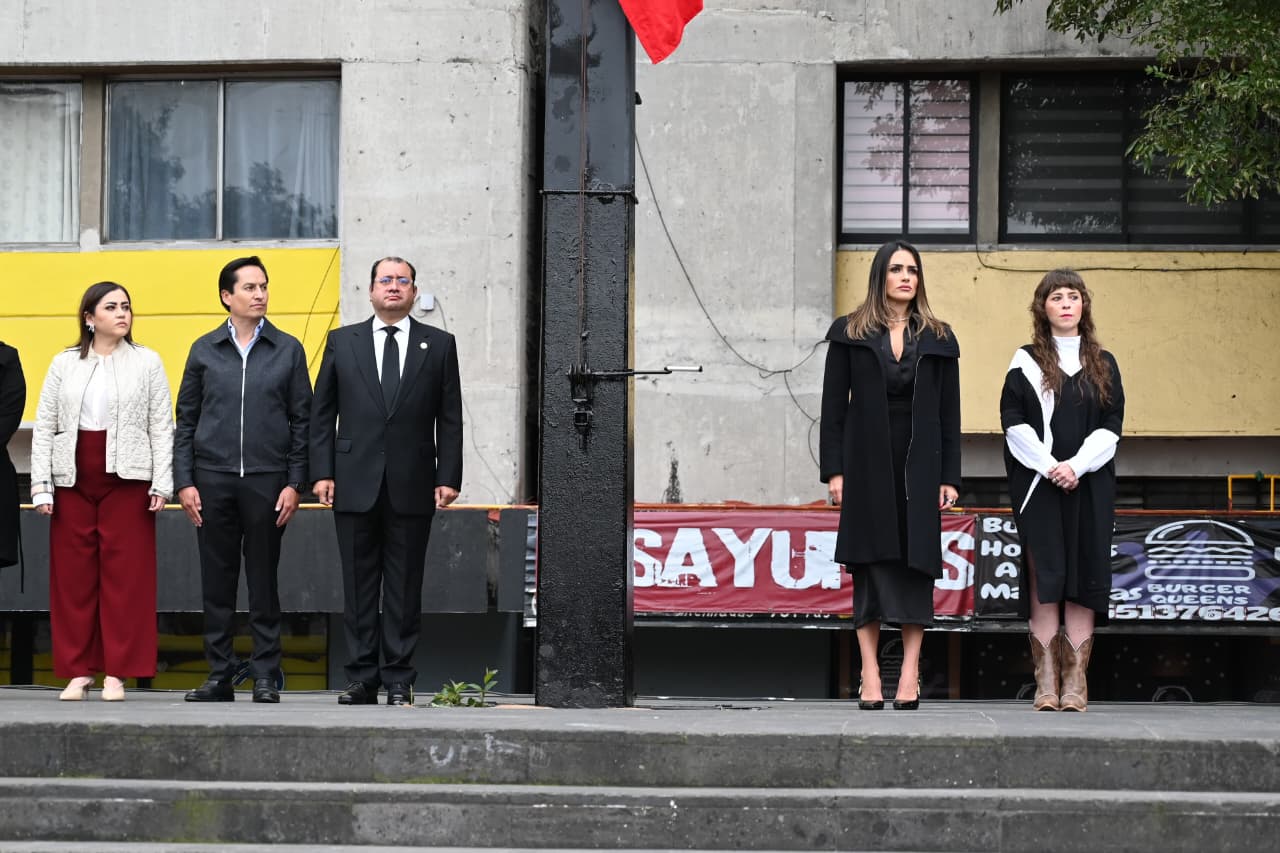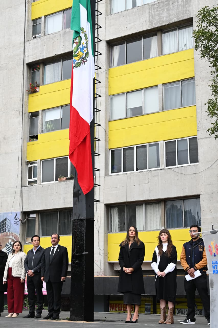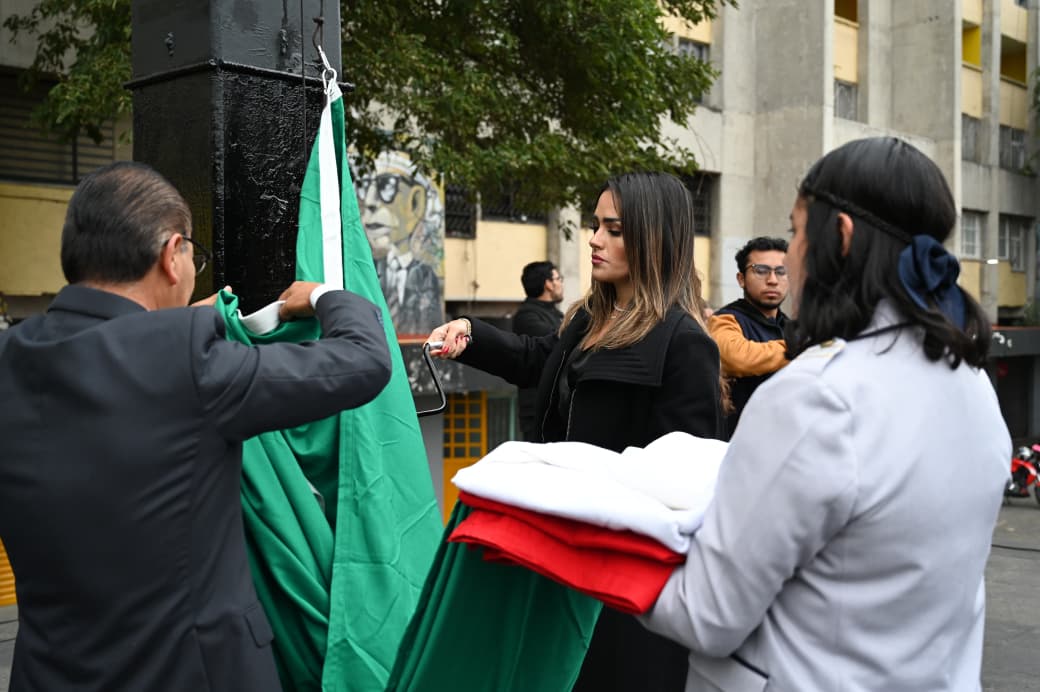 Como parte del homenaje, Ale Rojo de la Vega izó la bandera nacional a media asta y depositó una ofrenda floral al pie de la Estela de Tlatelolco.