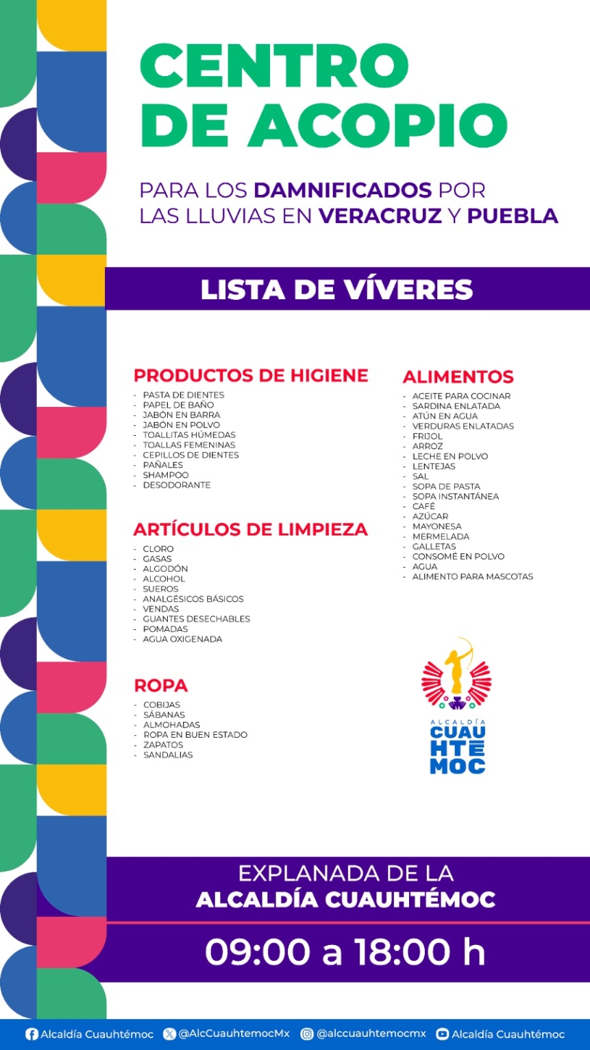 En solidaridad con las familias afectadas por las recientes lluvias en los estados de Veracruz y Puebla, la Alcaldía Cuauhtémoc abrió a partir de este martes un centro de acopio en la explanada principal del edificio sede, donde ya se reciben víveres y artículos de primera necesidad destinados a las comunidades damnificadas.