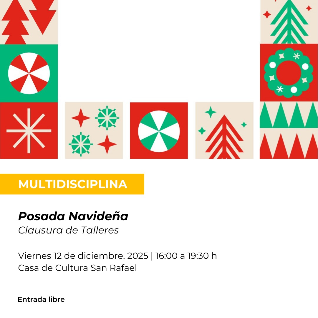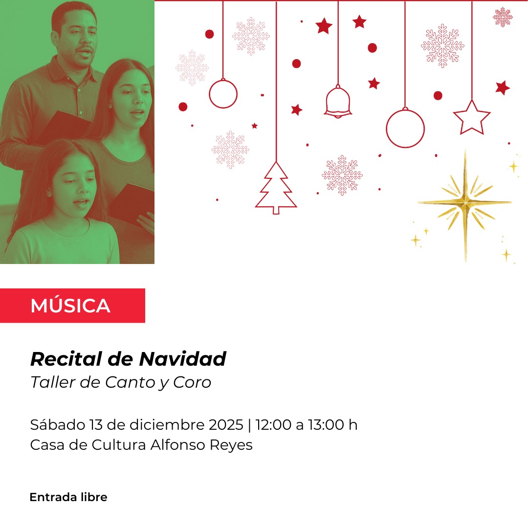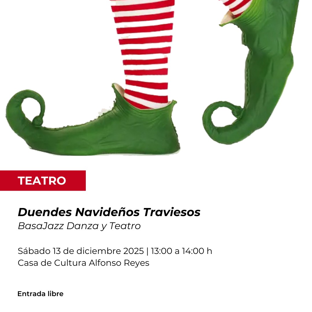 En la Casa de Cultura Alfonso Reyes se exhibe Opus Magnum, de Javier Bañuelos, hasta el 14 de diciembre, además de actividades como la Clase Navideña de Baile Aeróbico (9 de diciembre), el Recital de Navidad (13 de diciembre) y la obra Duendes Navideños Traviesos. En la Casa de Cultura San Rafael continúan la muestra Un portal hacia el ilapso (hasta el 12 de diciembre), la Posada Navideña y clausura de talleres (12 de diciembre), y la presentación literaria de Cuentos de amor y violencia (13 de diciembre).