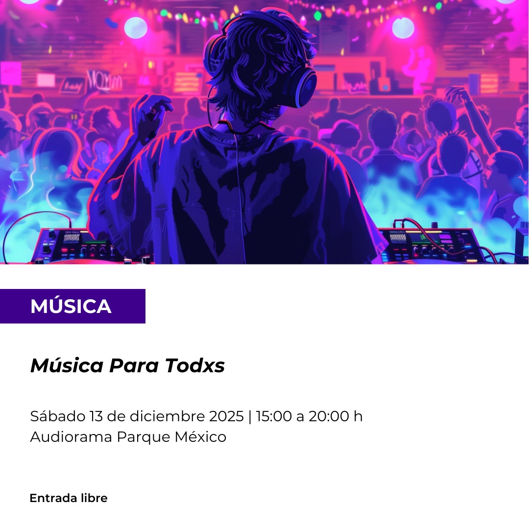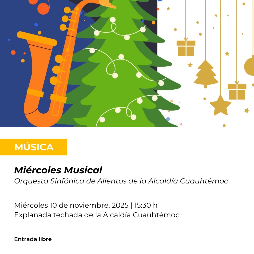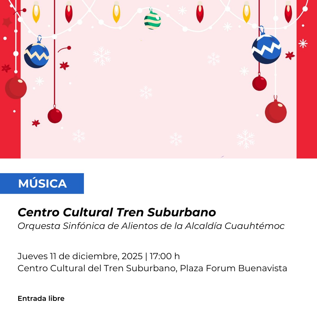 El Audiorama del Parque México recibirá el programa Música para Todxs el sábado 13 de diciembre, mientras que la Orquesta Sinfónica de Alientos de la Alcaldía ofrecerá dos conciertos: el Miércoles Musical (10 de diciembre) en la explanada techada, y otro en el Centro Cultural del Tren Suburbano (11 de diciembre).
