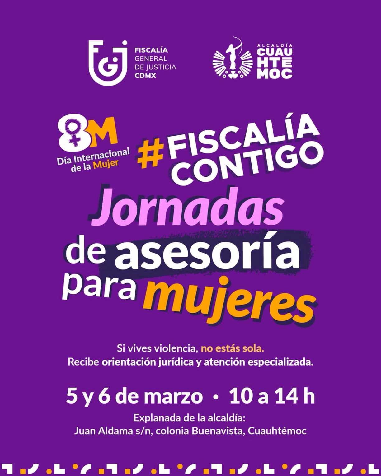 El 5 y 6 de marzo también se realizará en la explanada de la alcaldía la jornada “Fiscalía Contigo”, en colaboración con la Fiscalía General de Justicia de la Ciudad de México. Durante esta actividad, las mujeres que acudan podrán recibir orientación jurídica y atención especializada.