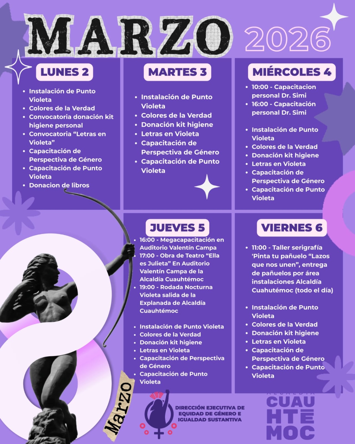 El viernes 6 de marzo a las 11:00 horas se realizará el taller de serigrafía “Pinta tu pañuelo: Lazos que nos unen”, con entrega de pañuelos durante el día en las instalaciones de la alcaldía. De forma paralela se instalarán nuevos Puntos Violeta y se impartirán capacitaciones en perspectiva de género. También habrá actividades como “Colores de la Verdad”, “Letras en Violeta” y donación de kits de higiene.