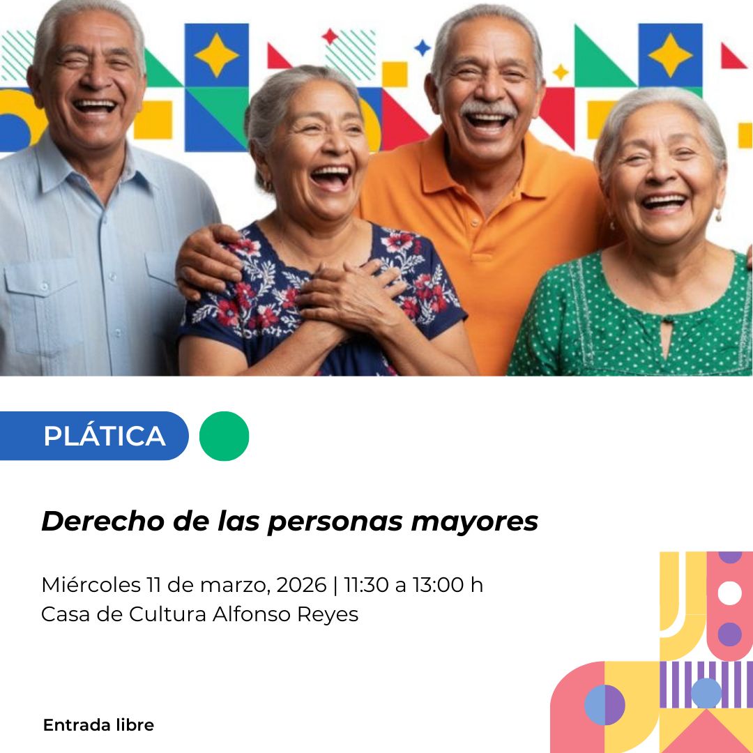 Ese mismo día, en la Casa de Cultura Alfonso Reyes, se realizará la plática “Derecho de las personas mayores”, de 11:30 a 13:00 horas, un espacio de reflexión y orientación sobre los derechos de este sector de la población.