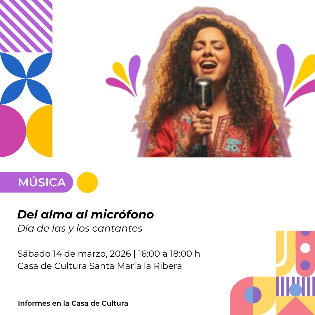 La agenda cultural continuará el sábado 14 de marzo con la actividad musical “Del alma al micrófono” por el día de las y los cantantes, que se llevará a cabo de 16:00 a 18:00 horas en la Casa de Cultura Santa María la Ribera.